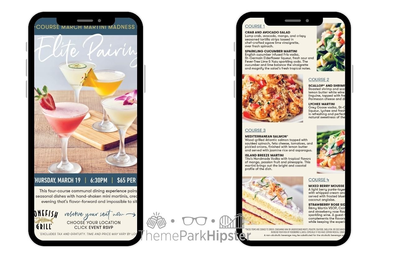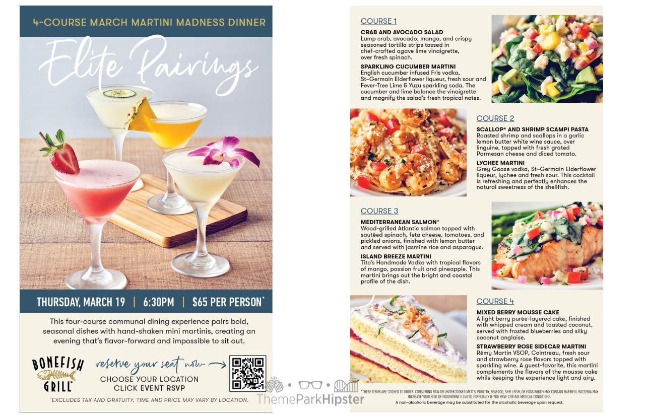 - Elite Pairings March Martini Madness (March 19): 4 courses + cocktail pairings (priced at $65 per person, excluding tax and gratuity)