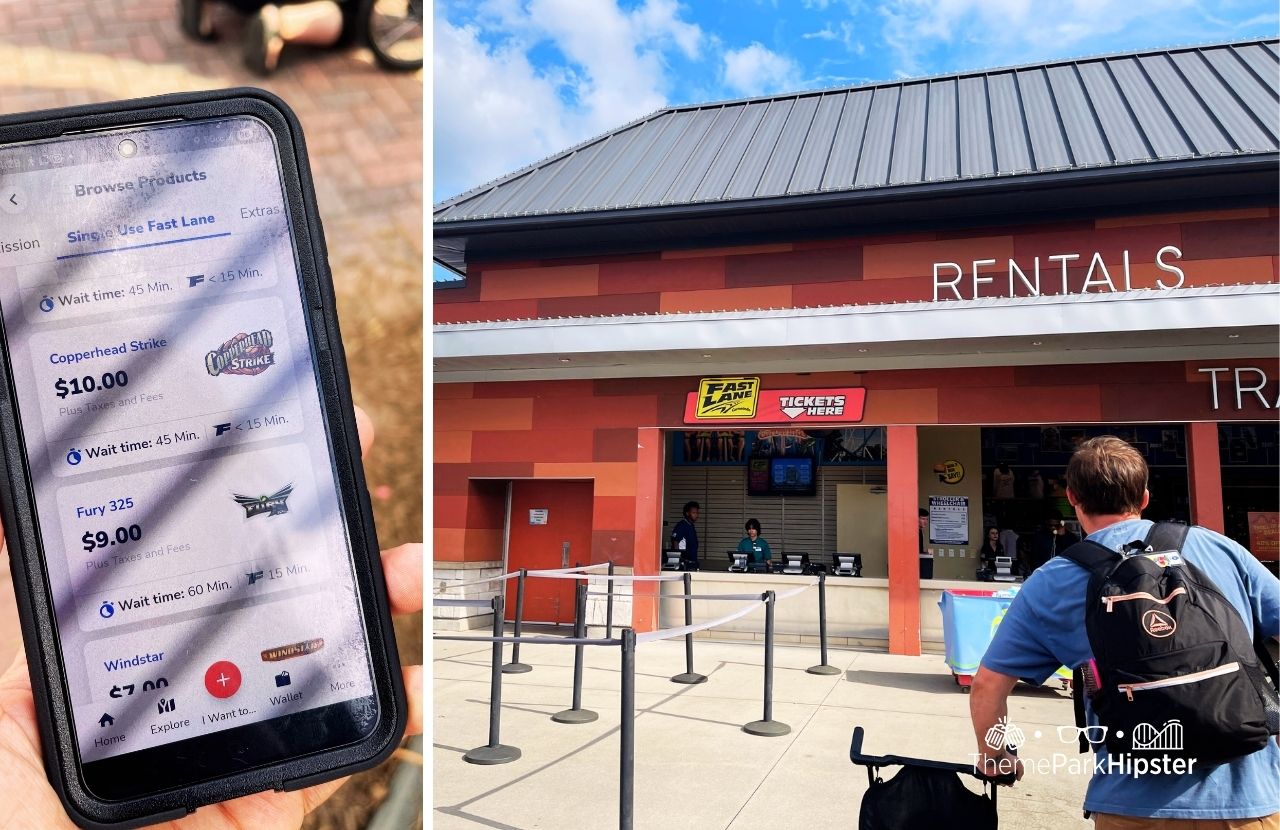 Carowinds lists Fast Lane access for major attractions including Fury 325, Copperhead Strike, Thunder Striker, Boo Blasters, and more. There’s also a Season Pass Fast Lane option for every-visit line skipping.