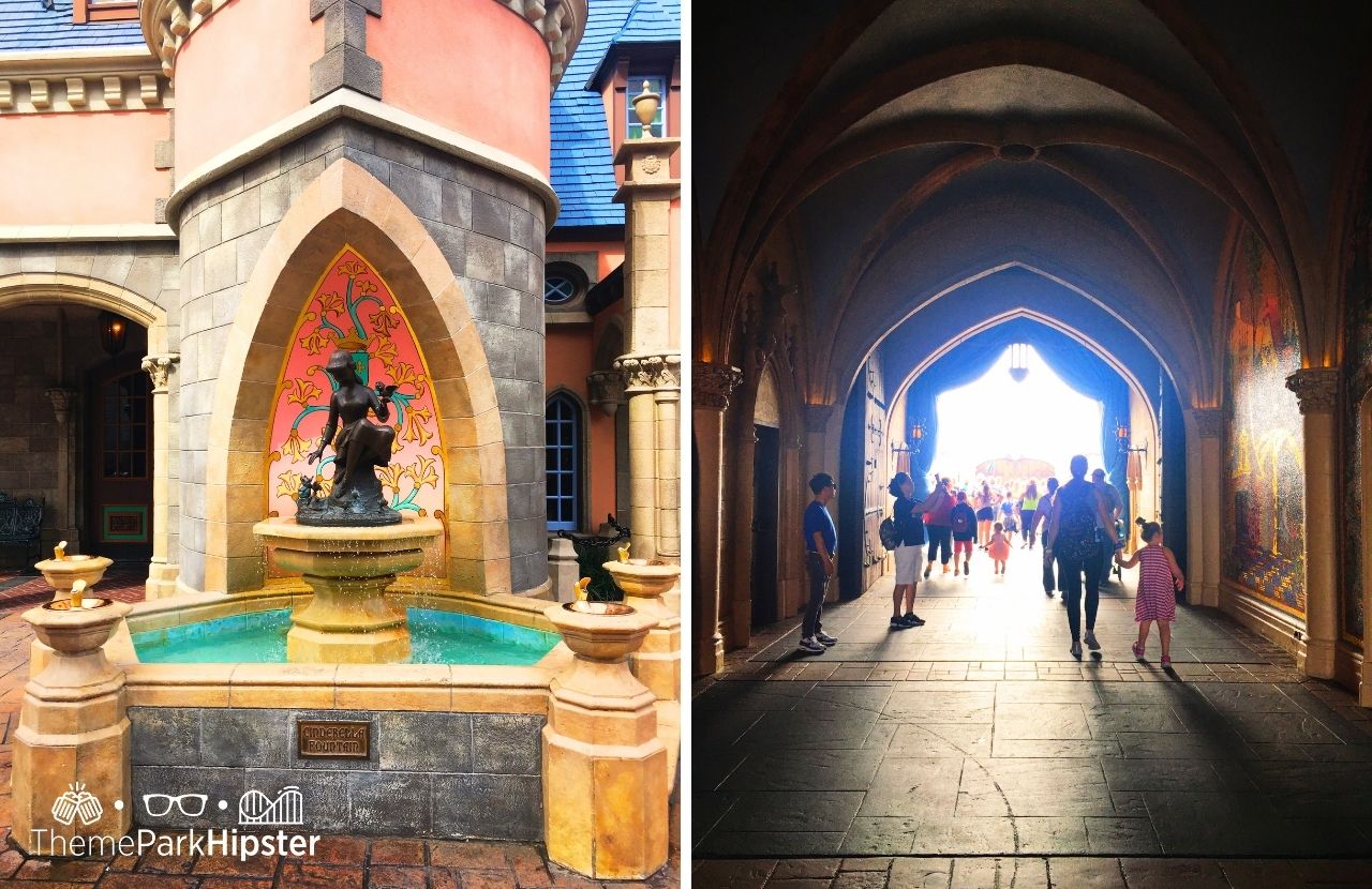 On the side of the castle is a fountain with Cinderella on it. Take a drink from the water fountain and you’ll automatically be bowing down to a princess.
