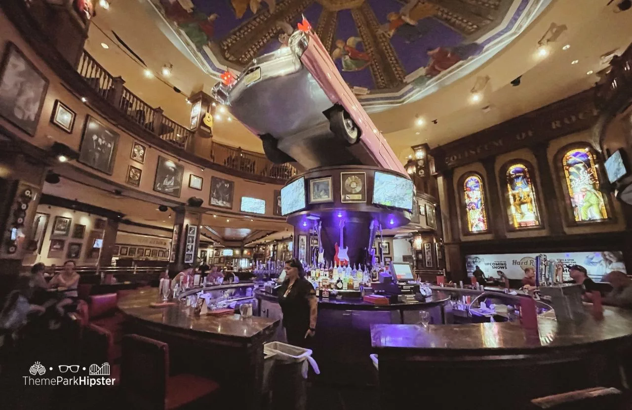 Let’s talk visuals. This place is intentionally dramatic with big pillars, a coliseum-style exterior, and the famous pink Cadillac in the center of the bart that makes you want to take a photo before you even sit down.